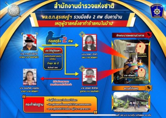 จากกรณีเมื่อวันที่ 27 ส.ค.65 เวลาประมาณ 08.00 น. สภ.ห้วยยอด ภ.จว.ตรัง รับแจ้งเหตุพบผู้เสียชีวิตจํานวน 2 ราย ประกอบด้วย นายสรัลยศ สิทธิโชค อายุ 29 ปี และ น.ส.นาถตยา เจ๊กคํา อายุ 28 ปี ถูกคนร้ายใช้อาวุธปืนยิงที่ ศีรษะจนทั้งคู่เสียชีวิต ภายในบ้านเลขที่ 243 หมู่ 5 ต.บางกุ้ง อ.ห้วยยอด จ.ตรัง ก่อนจะหลบหนีไป ตามที่ส่อื มวลชน และโซเชียลมีเดียได้นําเสนอข่าวไปแล้วนั้น
