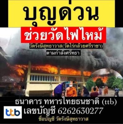 ทางวัดรังษีสุทธาวาส(วัดไร่กล้วย)  จึงขอเรียนเชิญท่านสาธุชนทั้งหลายได้ร่วมกันสละเงินปัจจัยตามแต่กำลังทรัพย์ ตามกำลังศรัทธาของท่านทั้งหลาย ได้ร่วมกันสร้างบุญในครั้งนี้  ซึ่งการสร้างเสนาสนะ กุฏิ ที่มุงบังไว้ให้ท่านพักผ่อน สวดมนต์ ปฏิบัติธรรม อานิสงส์นี้ย่อมส่งให้ท่านทั้งหลายมีความสุขความเจริญมีบ้านเรือนที่อาศัยที่ดีมีความเป็นอยู่ที่สุขสบายแม้ละสังขารจากโลกนี้แล้วจะได้มีวิมานทิพย์รองรับในสุคติโลกตามกำลังบุญที่ทำไว้ได้บรรลุมรรคผล นิพพาน เป็นที่สุดครับจึงขอบอกบุญมายังลูกศิษย์ หลวงพ่อน้ำหอม ช่วยกันทำบุญตามกำลังศรัทธา ช่วยวัดสร้างกุฏิหลังใหม่กัน และขออนุโมทนาในเจตนาอันเป็นกุศล ขอทุกท่านที่ร่วมบุญ จงมีแต่ความสุขความเจริญ ปราศจากทุกข์ สุขภาพแข็งแรง การเงินการงานรุ่งเรือง ทุกท่านเทอญ ร่วมบุญกับท่านโดยตรงที่วัดหรือโอนเข้าบัญชีของวัดรังษีสุทธาวาส(วัดไร่กล้วย)  ธนาคาร ทหารไทยธนชาติ (ttb) เลขบัญชี 6262630277  ชื่อบัญชี วัดรังษีสุทธาวาส(ไร่กล้วย)   #บุญด่วน ช่วยสร้างกุฏิให้วัดที่ถูกไฟไหม้ ตามกำลังศรัทธา