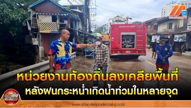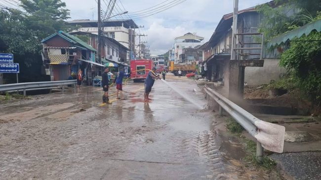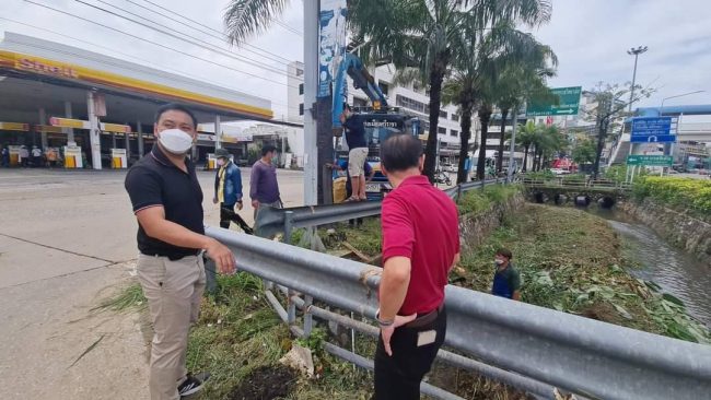 ที่ บริเวณชุมชนตลาดฉลอง นายวริศพันธ์ ทัตศิริวีรภัทร เลขานุการนายกเทศมนตรีนครเจ้าพระยาสุรศักดิ์ พร้อมสมาชิกสภา ผู้ใหญ่บ้าน นำเจ้าหน้าที่งานป้องกันและบรรเทาสาธารณภัย และรถฉีดน้ำมาทำความสะอาดโคลน ทรายทีขึ้มมาอยู่บนพื้นผิวจราจรจำนวนมาก พร้อมเก็บขยะออกจากท่อระบายน้ำ และที่ ท่อระบายน้ำริมถนนสุขุมวิท