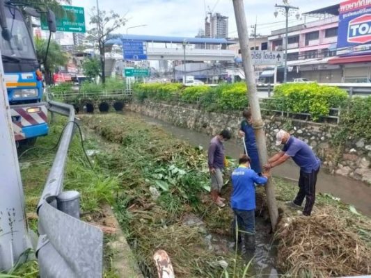 นายประภัส เจริญสันติสุข รองนายกเทศมนตรีเมืองศรีราชา นำเจ้าหน้ากองช่าง กองสาธารณสุข ลงพื้นที่เคลียเศษขยะ ทรายโคลน ที่ไหลมาอุดตันช่องทางระบายน้ำ โดยนายประภัส กล่าวว่า จากที่ได้ลงพื้นที่น้ำท่วมตั้งแต่เมื่อคืนที่ผ่านมา พบว่าน้ำในท่อระบายมีเพียงแค่ครึ่งเดียว