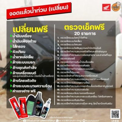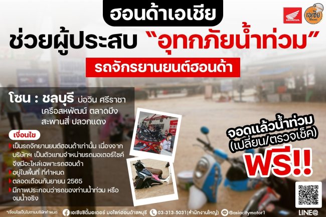 ทาง บริษัทเอเชียซิตี้มอเตอร์ มอเตอร์ไซค์ฮอนด้า มีความพร้อม และความประสงค์ช่วยเหลือรถมอเตอร์ไซค์ที่เสียหายจากการถูกน้ำท่วมในช่วงหน้าฝนนี้ ตลอดทั้งเดือน กันยายน 2565 สำหรับได้รับผลกระทบ และอยู่ในพื้นที่ จังหวัดชลบุรี – บ่อวิน ศรีราชา เครือสหพัฒน์ ตลาดบึง และจังหวัดระยอง – สะพานสี่ ปลวกแดง พร้อมและยินดีดูแลตรวจเช็ค และเปลี่ยนอะไหล่ให้ฟรีขอเพียง ถ่ายภาพรถมอไซค์ที่ถูกน้ำท่วมของท่าน มาประกอบต้องเป็นรถจักรยานยนต์ฮอนด้า HONDA เนื่องจากบริษัทฯ เป็นตัวแทนจำหน่ายรถมอเตอร์ไซค์ฮอนด้า จึงมีความพร้อมอะไหล่เฉพาะฮอนด้า