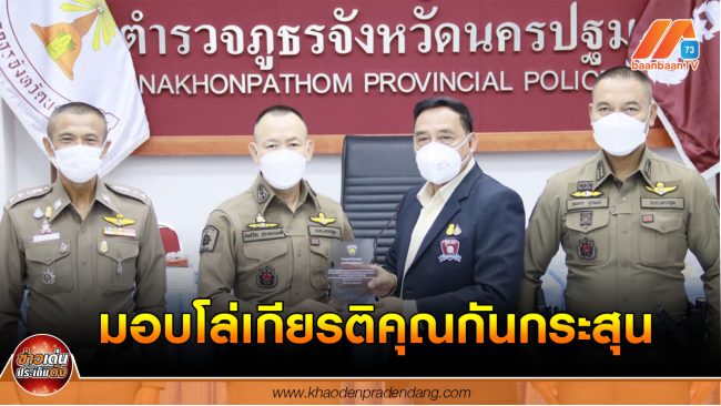 พล.ต.ต.ชมชวิณ ปุระธนานนท์ ผบก.ภ.จว.นครปฐม เป็นประธานมอบโล่ประกาศเกียรติคุณให้แก่ คณะ กต.ตร. จังหวัดนครปฐม และ คณะที่ปรึกษา กต.ตร.จังหวัดนครปฐม ที่สนับสนุนช่วยจัดหาโล่กันกระสุน จำนวน 14 อัน โดยมี กำนันยงยุทธ เพชรดี ตำแหน่ง กต.ตร.จ.นครปฐม พร้อมคณะ ร่วมมอบโล่ป้องกันแบบกันกระสุน