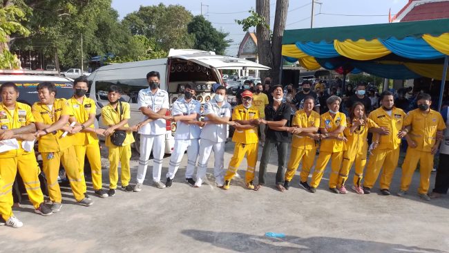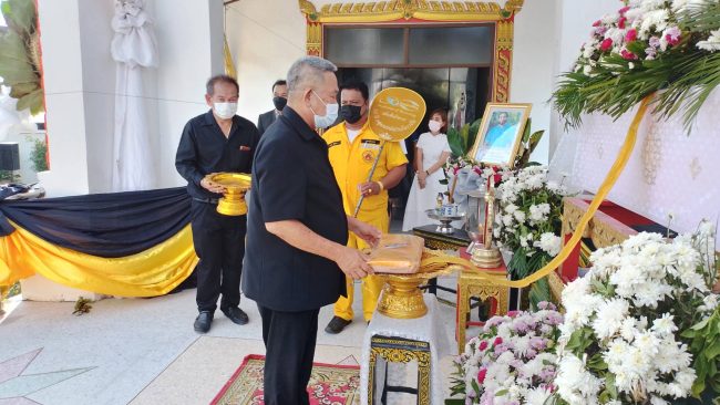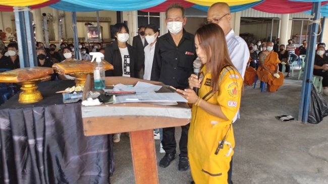 เมื่อเวลา15.45น.( 22ก.ย.2565) ที่เมรุวัดหนองปรือ ตำบลบึง อำเภอศรีราชา จังหวัดชลบุรี นายธนะพัฒน์ (นายกฮุ้น) พันเฉลิมชัยโชค นายกเทศมนตรีนครเจ้าพระยาสุรศักดิ์ ได้เดินทางมาเป็นประธานในพิธีฌาปนกิจศพ นายอังคาร นารี หรือน้าปุ้ย ด่านสาม อายุ 34ปี อาสาสมัครกู้ภัยบรรเทาสาธารณภัยและอุบัติภัยพุทธสมาคมเพียวเยี้ยงไท้ศรีราชา นามเรียกขานห้วยสะพาน18 ที่เสียชีวิตจากเหตุการณ์วูบล้มฟาดพื้นหัวใจวายเฉียบพลัน เมื่อวันเสาร์ที่17กันยายนที่ผ่านมา และเสียชีวิตลงที่บ้าน ซึ่ง”น้าปุ้ย” เป็นอาสากู้ภัยนิสัยดี มีความเสียสละ เป็นจิตอาสาช่วยเหลือสังคมโดยไม่เห็นแก่ความเหนื่อยยากเป็นที่ตั้ง จิตใจโอบอ้อมอารีต่อเพื่อนมนุษย์ สละเวลาว่างให้เป็นประโยชน์ต่อสังคมตลอดมายาวนานกว่า15 ปีที่เป็นอาสากู้ภัย จึงเป็นที่รักใคร่ของน้องๆอาสากู้ภัยทุกคนที่รู้จัก โดยในพิธีฌาปนกิจศพเมื่อนำศพเวียนรอบเมรุ แตรวงได้เล่นเพลงสามช่า ให้อาสากู้ภัยได้เต้นนำหน้าศพ กัน เนื่องจากผู้เสียชีวิตชอบความสนุกสนาน น่าเริง ชอบเสียงเพลง ซึ่งได้มี ญาติ เพื่อนอาสาสมัครกู้ภัยบรรเทาสาธารณภัยและอุบัติภัยพุทธสมาคมเพียวเยี้ยงไท้ศรีราชา นายสงกรานต์ ภาชนะ สมาชิกองค์การบริหารส่วนจังหวัดชลบุรี เขตอำเภอศรีราชา นายสมชาติ ชาติกิตสาร ประธานหน่วยบรรเทาสาธารณภัยและอุบัติภัยพุทธสมาคมเพียวเยี้ยงไท้ศรีราชา สมาชิกสภาเทศบาลนครเจ้าพระยาสุศักดิ์ ผู้นำท้องถิ่น และประชาชนชาวบ้านหนองปรือ ตำบลบึง อำเภอศรีราชามาร่วมในพิธีอย่างคับคั่งกว่า 300 คน และทางเพื่อนๆอาสาสม้ครกู้ภัยได้ร่วมกันร้องเพลง พันธุ์เดียวกัน และเพลงเราและนาย โดยต่างร้องเพลงกันทั้งน้ำตาเนื่องจากทุกคนทำใจไม่ได้ ต่อจากนั้น รถอาสากู้ภัยที่จอดอยู่ภายในบริเวณวัด จำนวนกว่า 30 คัน ได้พร้อมใจกันเปิดไฟสัญญาณฉุกเฉิน และเปิดเสียงไซเรนดังเป็นเวลา 9 นาที เพื่อส่งดวงวิญญาณ”นายอังคาร นารี หรือน้าปุ้ย ด่านสาม” ไปสู่สัมปรายภพ เพราะเพื่อนอาสากู้ภัยฯ ที่จากไปจากโลกนี้ เขารักในงานกู้ภัยและ รักในความเสียสละที่จะช่วยเหลือผู้คนในสังคมด้วยความเป็นจิตอาสามากว่า 15 ปีแล้ว โดยที่จากไปอย่างสงบโดยที่ยังไม่ได้ทันร่ำลาพี่น้องอาสากู้ภัย และญาติพี่น้องเลยสักคน จึงร่วมกันไว้อาลัยให้เป็นครั้งสุดท้ายเพื่อส่งดวงวิญญาน ให้ไปสู่สุขคติ ซึ่งทั้งงานเต็มไปด้วยน้ำตาของญาติพี่น้อง และอาสากู้ภัยที่รักและเคารพในตัวของผู้เสียชีวิต