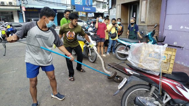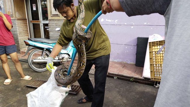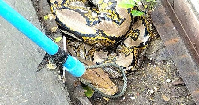 ศูนย์วิทยุเมืองนายก ได้รับแจ้งเหตุมีชาวบ้านแจ้งว่าพบงูเหลือมขนาดใหญ่นอนขดตัวอยู่ในรางตะแกรงเหล็กท่อระบายน้ำ บริเวณหน้าโรงรับจำนำเทศบาลเมืองนครนายก ทางเข้าตลาดสด จึงประสานมูลนิธิกู้ภัยร่วมกตัญญูจุดเมืองนครนายก ไปยังที่รับแจ้ง พบชาวบ้านกำลังมุ่งดูงูเหลือมตัวใหญ่กำลังเลื้อยจะหลบหนี เจ้าหน้าที่ร่วมกตัญญูได้เปิดฝาตะเกรงเหล็กและนำอุปกรณ์ที่นำมาเข้าไปคล้องหัวงูเหลือมออกมาได้สำเร็จ พบว่างูเหลือมตัวใหญ่นี้เป็นงูเหลือมหางขาดได้ขี้ใส่เจ้าหน้าที่กู้ภัยฯ งูเหลือมตัวนี้มีความยาวประมาณ 3 เมตรน้ำกว่า 30 โล เจ้าหน้าที่กู้ภัยร่วมกตัญญูจึงได้นำงูเหลือมใส่ลงกระสอบปุ๋ยและนำไปปล่อยในแหล่งธรรมชาติต่อไป