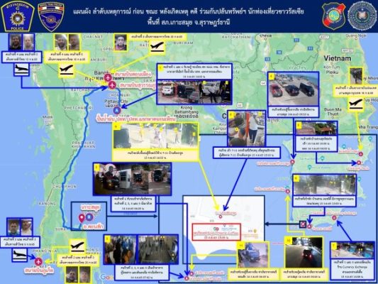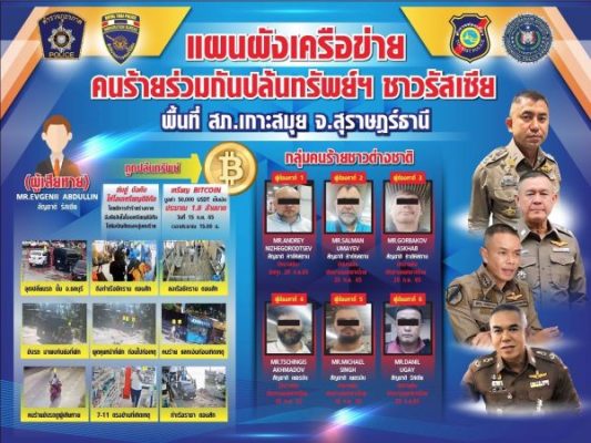 และ MR.DANIL UGAY สัญชาติรัสเซีย ซึ่งเป็นกลุ่มคนร้าย ได้เดินทางเข้ามาในราชอาณาจักรไทยพร้อมกัน เมื่อวันที่ 25 ก.ค.2565 และคาดว่ามาก่อเหตุ ภายหลังได้เดินทางออกจากราชอาณาจักรไทย เมื่อวันที่ 28 ก.ย.2565 ตามลำดับ ซึ่งเจ้าหน้าที่ตำรวจจะได้ดำเนินการสืบสวนติดตามจับกุมตัว รวมทั้งดำเนินการประสานองค์การตำรวจสากล (INTERPOL) เพื่อออกหมายแดง (Red Notice) ตามกฎหมายต่อไป