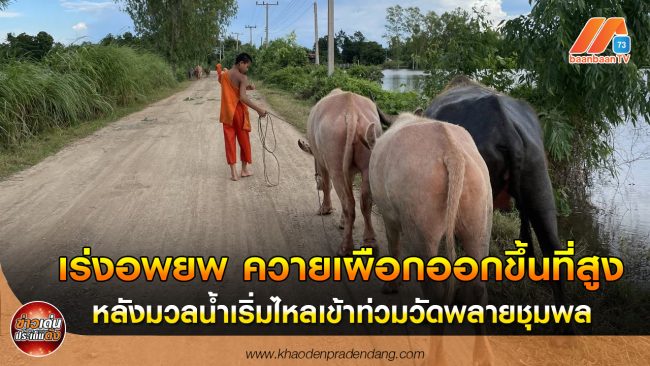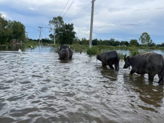 ล่าสุด เมื่อเวลา 15.30น.วันนี้(6ต.ค.) มวลน้ำดังกล่าวได้ทะลักเข้าท่วมในพื้นที่ บ้านหางคลอง ม.5 ต.บ้านกล้วย อ.เมืองสุโขทัย ทำให้ชาวบ้าน ต้องรีบขนย้ายข้าวของจำเป็นขึ้นที่สูง นอกจากนี้ที่วัดพลายชุมพล ม.5 ต.บ้านกล้วย พระครูปลัดวิมลสิทธิวัฒน์ (หลวงพี่นาค) เจ้าอาวาสวัดพลายชุมพลพร้อมพระลูกวัด ต้องรีบขนย้ายฝูกควายที่เลี้ยงไว้ภายในวัดออกมาจำนวน 19 ตัว โดยมีควายเผือกจำนวน 11ตัว ออกมาอยู่บนที่สูงเป็นการชั่วคราว เนื่องจากมวลน้ำเพิ่มขึ้นสูงอย่างรวดเร็ว