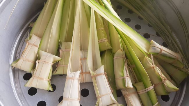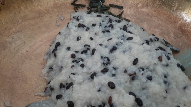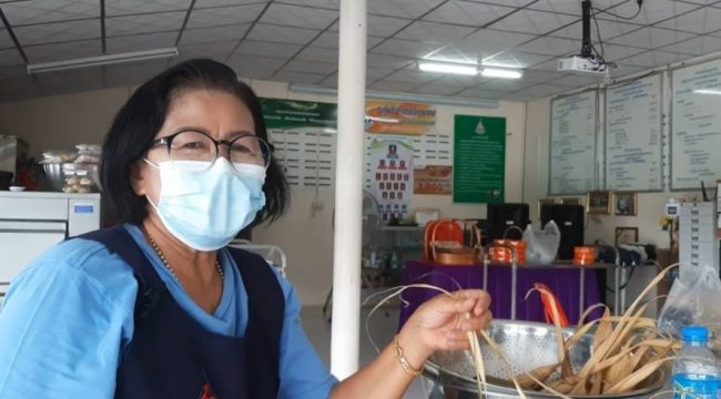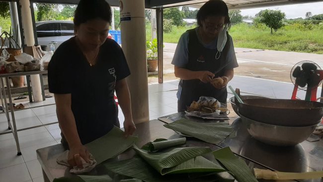 นางสัมฤทธิ์ ทองวิเชียร ประธานกลุ่มวิสาหกิจชุมชนแม่บ้านเกษตรกรเนินกระบก หมู่ที่ 5 ตำบลบ่อวิน อำเภอศรีราชา จังหวัดชลบุรี ได้เปิดเผยว่าจะต้องตักบาตรด้วย ข้าวต้มลูกโยน ขนมที่ปู่ย่าตาทวดทำขึ้นมาเพื่อการนี้โดยเฉพาะและต่อเนื่องตลอดมา “ข้าวต้มลูกโยน” หรือ “ข้าวต้มหาง” ลักษณะคล้ายข้าวต้มมัดแต่มีขนาดเล็กกว่าอีกทั้งในรูปแบบการห่อมีเอกลักษณ์โดดเด่นโดยจะไว้หางยาวเพื่อความสะดวกในการใส่บาตร