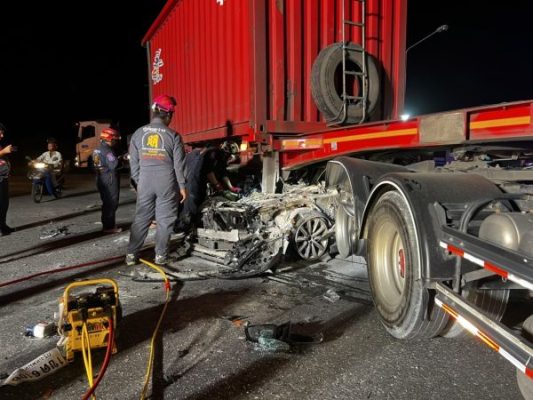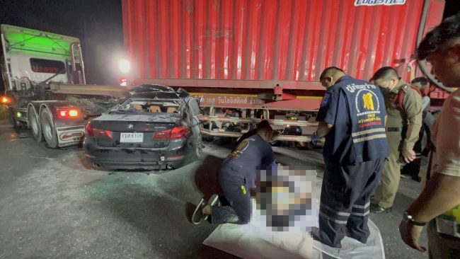 ที่เกิดเหตุพบรถพ่วง 18 ล้อ หมายเลขหัวลาก 72-3567 ระยอง หมายเลขส่วนห่าง 71-1593 ระยอง ของบริษัท เอสวันโลจิสติกส์ จำกัด จอดแน่นิ่งขวางเต็มถนน ที่กลางส่วนพ่วงใต้ตู้คอนเทนเนอร์มีรถยนต์หรู ยี่ห้อบีเอ็มดับเบิลยู รุ่น530 อี สีดำ หมายเลขทะเบียน 1 ขด 6160 กทม ชนอัดติดคาซาก สภาพพังยับเยินอยู่ใต้ท้องรถ ภายในรถยังพบร่างนาย กฤษดา พยุงผล อายุ 31 ปี เป็นเจ้าของโครงการหมู่บ้านแห่งหนึ่ง และบริษัทรับเหมาออกแบบ เสียชีวิตอยู่ที่เบาะคนขับ เจ้าหน้าที่กู้ภัยฯ ใช้เวลากว่า 30 นาที จึงงัดร่างผู้เสียชีวิตออกจากตัวรถได้ เพื่อจะทำการย้ายรถออกจากที่เกิดเหตุ เนื่องจากอุบัติเหตุสลดครั้งนี้ ทำให้การจราจรติดขัดยาวกว่า 10 กิโลเมตร