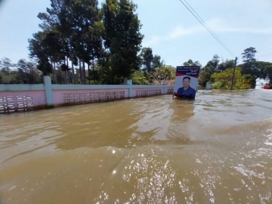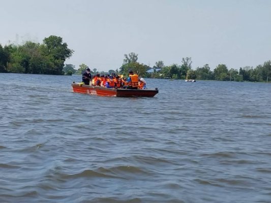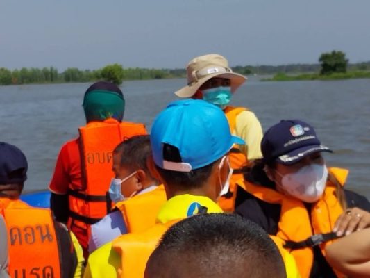หลังจากนั้นคณะจะเดิทางไปยังท่าเรือชั่วคราว เพื่อลงเรือท้องแบนไปมอบเครื่องอุปโภคบริโภค และสุขากระดาษ ให้กับประชาชนที่บ้านเรือนถูกตัดขาดจากกระแสน้ำ บริเวณบ้านโนนทราย ตำบลดอนแรด อำเภอรัตนบุรี จังหวัดสุรินทร์