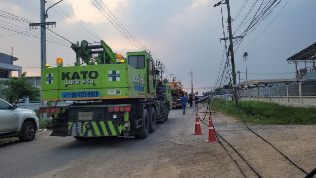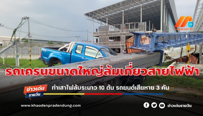 รถเครนขนาดใหญ่ล้มเกี่ยวสายไฟฟ้าทำเสาไฟล้มระนาว 10 ต้น รถยนต์เสียหาย 3 คัน