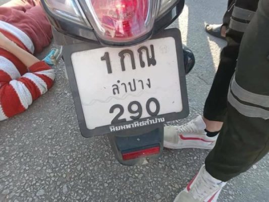 ที่เกิดเหตุบนถนนพบรถจักรยานยนต์ยี่ห้อฮอนด้า wave สีน้ำเงิน หมายเลขทะเบียน 1 กฎ 2711 ลำปาง และอีกคนัเป็นรถจักรยานยนต์ยี่ห้อฮอนด้า สกูปี้ สีดำ หมายเลขทะเบียน 1 กณ 290 ลำปาง ล้มอยู่กลางถนน ใกล้กันพบผู้บาดเจ็บ เป็นหญิง 2 ราย และชาย 1 รายที่ผู้ได้รับบาดเจ็บรายที่1 เป็นหญิง รู้สึกตัวดี แผ่นหลังมีอาการปวด รายที่2 เป็นหญิง รู้สึกตัวดี เข่าซ้ายมีอาการปวด รายที่ 3 เป็นชาย รู้สึกตัวดี ถลอกฟกช้ำทั่วไปตามร่างกาย เจ้าหน้าที่ให้การช่วยเหลือปฐมพยาบาลเบื้องต้น ก่อนนำผู้ได้รับบาดเจ็บทั้ง 3 รายส่งรักษาต่อที่ รพ.ลำปาง ส่วนสาเหตุอยู่ในระหว่างการสอบสวน.