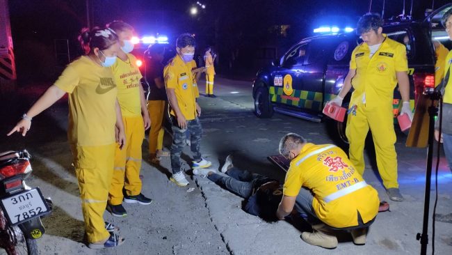 จึงช่วยกันปฐมพยาบาลทำบาดแผล โดยผู้บาดเจ็บได้บอกว่า ขี่รถจยย.ตกหลุมที่ทางผู้รับเหมาวางท่อประปาขุดเจาะไว้ จนเสียหลักรถจยย.ล้มคว่ำจนหมดสติไป ซึ่งทางผู้รับเหมาขุดเจาะเพื่อเตรียมวางท่อประปาเป็นแนวยาวไว้โดยไม่มีการติดไฟส่องสว่างไว้ให้เห็นเด่นชัด ประจวบกับตนเมายาดองมาด้วยจึงเสียหลักรถจยย.ล้มบาดเจ็บอีกด้วย หลังจากปฐมพยาบาลทำบาดแผลเสร็จสิ้นจึงรีบนำร่างผู้บาดเจ็บส่งโรงพยาบาลสมเด็จพระบรมราชเทวี ณ ศรีราชาให้แพทย์ทำการรักษาอาการบาดเจ็บต่อไป โดยทางอาสาหน่วยกู้ภัยเพียวเยี้ยงไท้ศรีราชา กล่าวว่าถนนหนองปรือ-ห้วยเฝ้า เส้นนี้มีการขุดวางท่อประปาโดยผู้รับเหมาบางจุดขุดเจาะแล้วไม่มีการติดตั้งไฟส่องสว่างไว้ให้เห็นเด่นชัด จึงเกิดอุบัติเหตุบ่อยครั้งทำให้มีผู้ได้รับบาดเจ็บและรถพังเสียหายเป็นประจำ