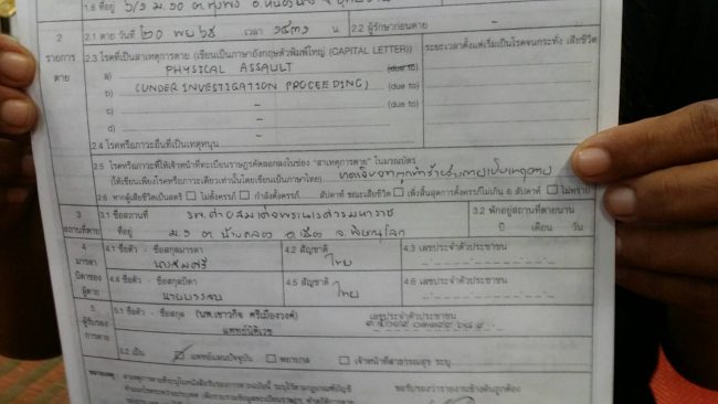 หลังจากวางสายจากผบ.เรือนจำแล้ว ได้มีผู้ใหญ่บ้านหมู่ 10 ต.ทุ่งพง อ.หนองฉาง จ.อุทัยธานี ได้โทรมาหาตัวแม่ แล้วบอกให้แม่โทรไปหาเจ้าหน้าที่ตำรวจที่พิษณุโลก หลังจากโทรไปแล้ว ก็ได้คำตอบว่าลูกชายที่เป็นพลทหารเสียชีวิตลงที่โรงพยาบาลค่ายสมเด็จพระนเรศวรมหาราช จังหวัดพิษณุโลก ซึ่งสร้างความตกใจให้กับตัวแม่มาก พร้อมกับมีหน่วยงานทางทหารมารับตัวแม่ที่บ้านที่จังหวัดอุทัยธานี เพื่อเดินทางไปยังจ.พิษณุโลก ได้แวะที่ รพ.พุทธชินราช ไปพบแพทย์ และได้รับแจ้งจากคุณหมอว่า ลูกชายตนเองได้ถูกทำร้ายบาดเจ็บจากถูกทำร้ายร่างกายเป็นเหตุให้ถึงตาย ตามที่หนังสือรับรองการตายจาก รพ .ดังกล่าว