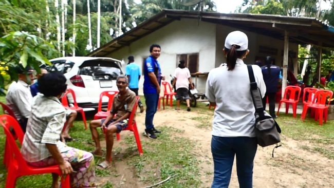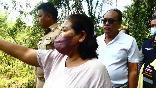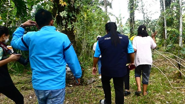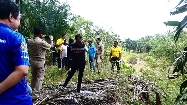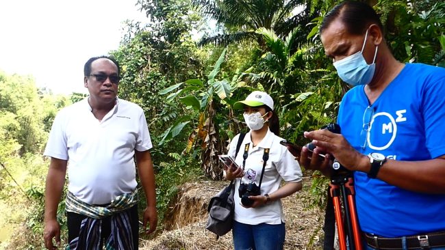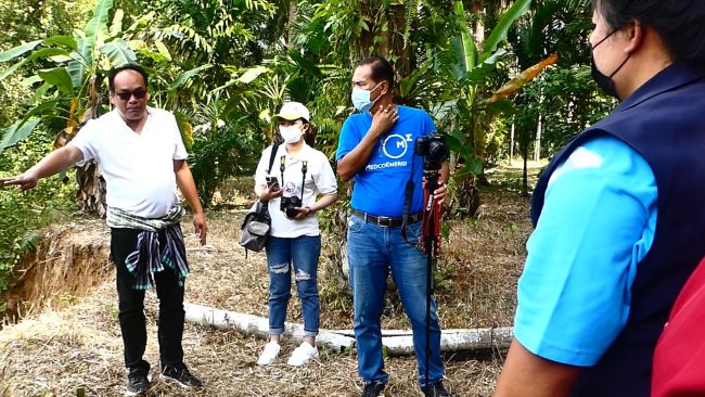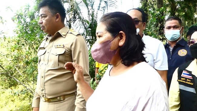 จากนั้นขาวบ้านได้นำ นายนพพร อุสิทธิ์ นายกฯ.อบจ. และคณะสื่อมวลชนลงพื้นที่สวนปาล์มของ “ป้าดา” นางวรพรรณ สุขภิลาภ อายุ 57 ปี อยู่บ้านเลขที่ 16 ม.1 ต.ทรัพย์อนันต์ อ.ท่าแซะ จ.ชุมพร ที่จากเดิมแปลงนี้เป็นดินโฉนดมีพื้นที่จำนวน 3 ไร่เศษ แต่ถูกน้ำหลากกัดเซาะจนที่ดินบนทราย ที่มีความสูงประมาณ 25 – 30 เมตรถล่มลงไป จนเหลือที่ดินประมาณเพียง 1 ไร่เศษเท่านั้น และบริเวณใกล้เคียงกัน ซึ่งเป็นที่ดินบ้านของ “ลุงจ้ง” นายภิญโญ ตรีทศ บ้านเลขที่ 18 ม.1 ต.ทรัพย์อนันต์ อ.ท่าแซะ จ.ชุมพร แปลงนี้ก็ที่ดินโฉนดมีทั้งหมด 6 ไร่ ปลูกปาล์มเอาไว้ทั้งแปลง