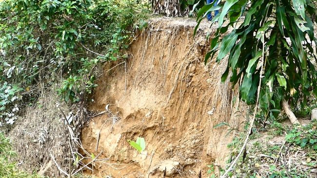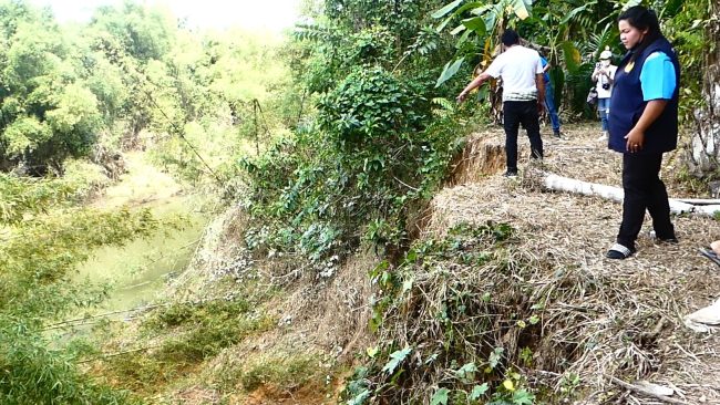 แต่ถูกน้ำหลากกัดเซาะจนที่ดินที่มีความสูง 25 – 30 เมตรถล่มลงมาและหายไปกว่า 4 ไร่ จากเดิมแปลงนี้ได้ปลูกปาล์มเอาไว้ 120 ต้น แต่ปัจจุบันเหลืออยู่เพียง 1 ไร่เศษและทิ้งเหลือต้นปาล์มทิ้งไว้ให้ดูซ้ำใจเพียง 32 ต้นเท่านั้น โดยที่ดินโฉนดแปลงนี้ก็ถูกน้ำกัดเซาะถล่มหายไปกว่า 4 ไร่อีกเช่นกัน
