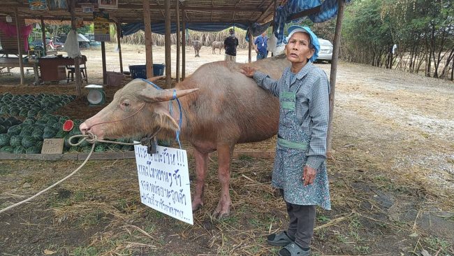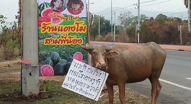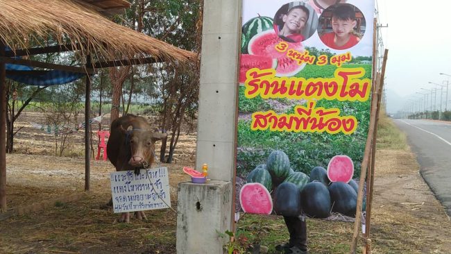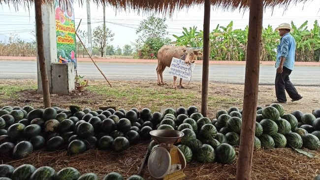 เมื่อเวลา 15.00.น.ของวันที่ 05 ก.พ.66 ผู้สื่อข่าวรายงานที่ถนนสายการุ้ง-บ้านไร่ ตำบลหูช้าง อ.บ้านไร่ จ.อุทัยธานี ได้มีร้านขายขายแตงโมหลายขนาด หลายพันธุ์ แต่ที่หน้าแปลกกว่านั้นได้มีเจ้าเผือก ตัวผู้อายุ 1 ขวบครึ่ง ควายสีเผือก ยืนอยู่หน้าร้านขายแตงโม ซึ่งติดกับถนนที่รถวิ่ง ที่ด้านหน้ามีป้ายเรียกลูกค้า จำใจความว่า แวะซื้อแวะร้านแตงโมหวานๆจ้า จอดหน่อยนะลูกค้า #วันนี้มาช่วยพ่อขาย