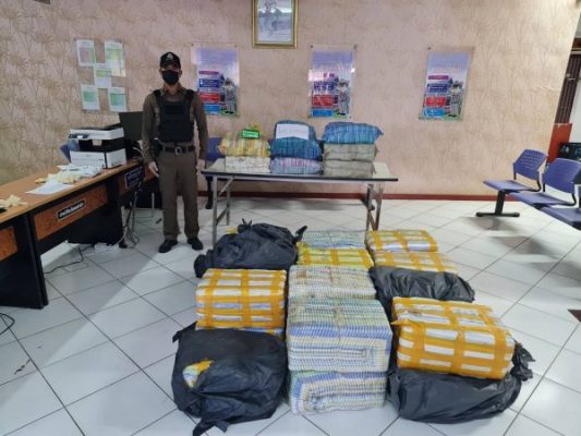 จากการตรวจสอบเบื้องตันพบ ยาบ้าของกลาง บรรจุอยู่ภายในกระสอบฟาง จำนวน 23 กระสอบ โดยแต่ละกระสอบ มีกระดาษไขห่อหุ้มไว้เป็นมัด ลักษณะกระดาษไขมีอักษรภาษาอังกฤษ iphone ด้านหนึ่ง และอีกด้านมีอักษร 999 และมีรูปดาวอยู่ด้านบน จำนวน 5 ดาว จำนวน 60 มัด แต่ละมัดมี 5 ก้อน แต่ละก้อนมีจำนวน 10 ถุง แต่ละถุงมียาบ้า จำนวน 200 เม็ด โดยมียาบ้า ต่อ 1 กระสอบฟางละประมาณ 200,000 เม็ด รวมยาบ้าทั้งหมด ประมาณ 4,600,000 เม็ด และพบไอซ์ บรรจุอยู่ภายในกระสอบฟาง 7 กระสอบ แต่ละกระสอบพบถุงชาสีเขียว มีอักษรภาษาอังกฤษ GUANYIN WANG และมีภาษาจีนอยู่ตรงกลาง และด้านบนมีตัวเลข 88888 มีรูปดาวอยู่ต้านบน 5 ดาว รวมไอซ์บรรจุอยู่ในถุงชาสีเขียว จำนวน 133 ถุง ถุงละ 1 กิโลกรัม รวมไอซ์ประมาณ 133 กก.จึงได้ตรวจยึดเอาไว้ดำเนินการสอบสวนตามกฎหมายต่อไป