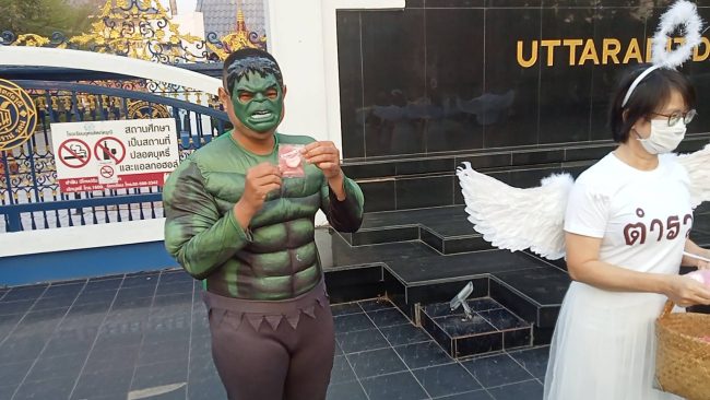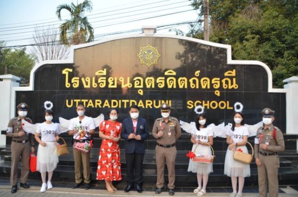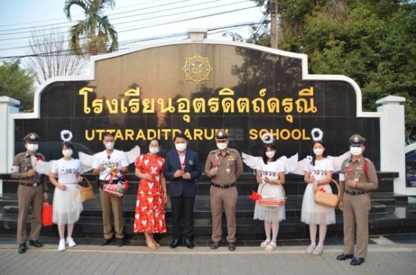 พ.ต.อ.สมเกษม จารักษ์ ผกก.สภ เมืองอุตรดิตถ์ กล่าวว่า เนื่องในวันวาเลนไทน์ สถานีตำรวจภูธรเมืองอุตรดิตถ์ ขอส่งมอบความรักความปรารถนาดีให้กับพี่น้องประชาชนและเยาวชนคนไทย จึงได้จัดชุดเจ้าหน้าที่ตำรวจ สภ.เมืองอุตรดิตถ์ แจกดอกไม้ , อมยิ้มรูปหัวใจ และ ป็อบคอร์นสีชมพู ให้กับเด็กนักเรียนวัยประถมศึกษาชั้น ป.1-ป.6 และ เด็กมัธยมศึกษาชั้น ม.1-ม.6 ตลอดจนพี่น้องประชาชนผู้ใช้รถใช้ถนน ตามเส้นทางสายหลักเขตเทศบาลเมืองอุตรดิตถ์ พร้อมทั้งเจ้าหน้าที่ตำรวจแต่งกายธีมวันวาเลนไทน์ ยอมถอดเครื่องแบบมาในชุดคิวปิด ” เทพเจ้าแห่งความรัก” ตลอดจนนำรถตุ๊กตุ๊ก หรือ จ่าตุ๊กสุขเกษม ซึ่งเป็นรถที่ถูกสั่งทำขึ้นมาเป็นพิเศษ เพื่อนำมาบริการนักท่องเที่ยวและประชาชน ขับรถตระเวนรอบเมืองอุตรดิตถ์แจกทั้งดอกไม้สีแดง สร้างความรักความปรารถนาดี ให้กับประชาชนผู้ใช้รถใช้ถนน เนื่องในโอกาสวันแห่งความรัก ปี 2566