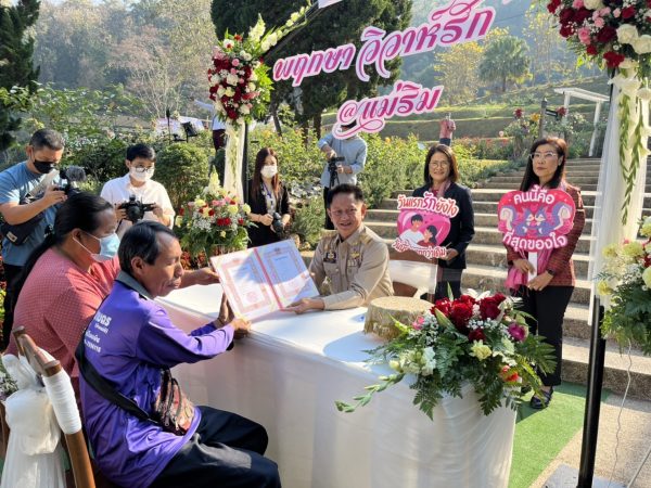 วันที่ 14 กุมภาพันธ์ 2566 ณ Rose Garden บริเวณกลุ่มอาคารเรือนกระจก สวนพฤกษศาสตร์สมเด็จพระนางเจ้าสิริกิติ์ จังหวัดเชียงใหม่ นางสาวปัถวี แสงฉาย ผู้อำนวยการสำนักบริหาร องค์การสวนพฤกษศาสตร์ พร้อมด้วย นายภัควัต ขันธหิรัญ นายอำเภอแม่ริม ร่วมกันเป็นสักขีพยานงานจดทะเบียนสมรส “พฤกษาวิวาห์รัก@แม่ริม” โดยมีคู่รักจำนวน 17 คู่ ทั้งชาวไทยและชาวต่างประเทศ เข้าร่วมงาน