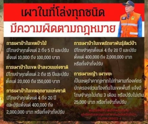 การเผาป่าในเขตป่าไม้ มีโทษจำคุกตั้งแต่ 2 ถึง 5 ปี และปรับตั้งแต่ 10,000 ถึง 100,000 บาท การเผาป่าในเขต ป่าสงวนแห่งชาติมีโทษจำคุกตั้งแต่ 2 ถึง 15 ปีและปรับตั้งแต่ 20,000 ถึง 150,000 บาท การเผาป่าในเขตอุทยานแห่งชาติมีโทษจำคุกตั้งแต่ 4 ถึง 20 ปีและปรับตั้งแต่ 400.000 ถึง2,000,000 บาท หรือทั้งจำทั้งปรับ การเผาป่าในเขตรักษาพันธุ์สัตว์ป่ามีโทษจำคุกตั้งแต่ 4 ถึง 20 ปี และปรับตั้งแต่ 400,000 ถึง 2,000,000 บาทหรือทั้งจำทั้งปรับ การเผาหญ้า เผาขยะเป็นเหตุรำคาญหากไม่ทำตามที่องค์กรปกครองส่วนท้องถิ่นในเขตพื้นที่แจ้ง มีโทษจำคุกไม่เกิน 3 เดือน หรือปรับไม่เกิน25,000 บาท หรือทั้งจำทั้งปรับ
