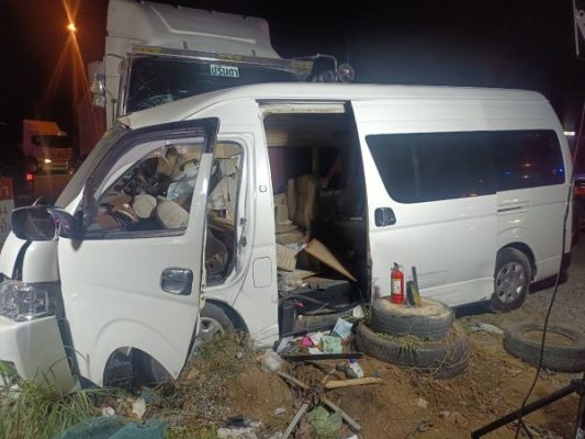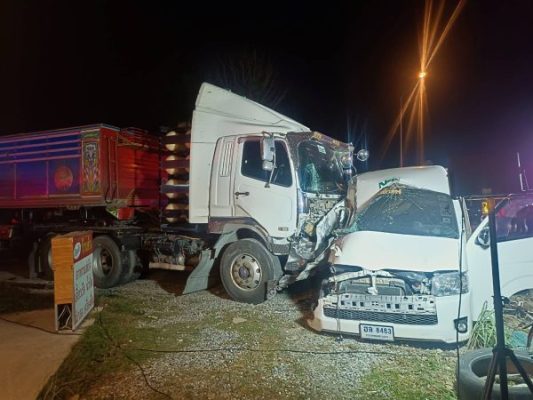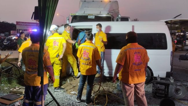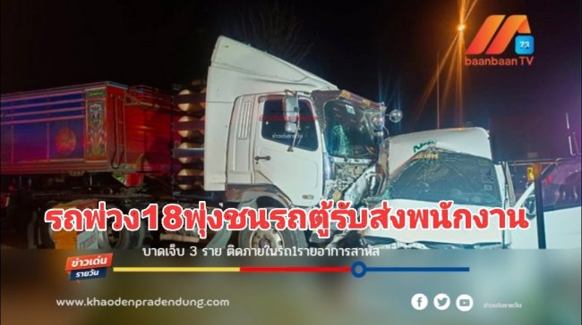 จ.ชลบุรี รถพ่วง18ล้อหักหลบรถเก๋งเสียหลักพุ่งชนรถตู้รับส่งพนักงานโรงงานบาดเจ็บ 3 ราย ติดภายในรถ1รายอาการสาหัส