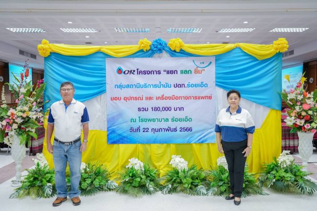 ร้อยเอ็ด/…คณะผู้บริหารจาก PTT OR และผู้แทนจำหน่ายสถานีบริการน้ำมันในจังหวัดร้อยเอ็ด บริจาคเตียงไฟฟ้า จำนวน 4 เตียง มูลค่ารวม 160,000 บาท และเงินจำนวน 20,000 บาท เพื่อช่วยเหลือผู้ป่วยตามโครงการ “แยกแลกยิ้ม”