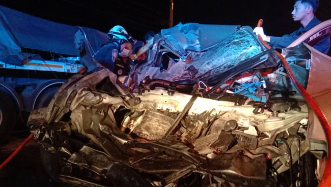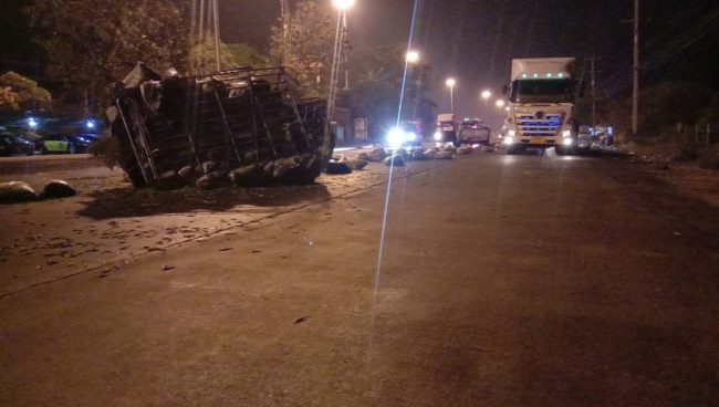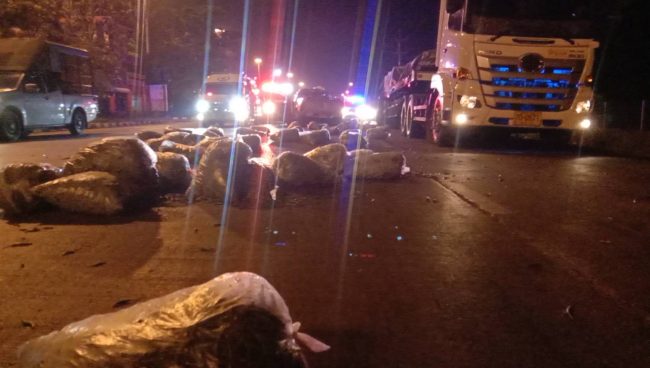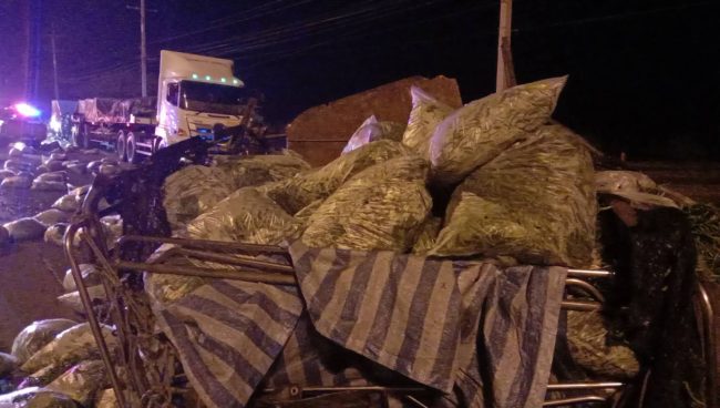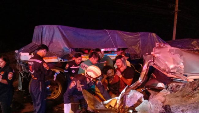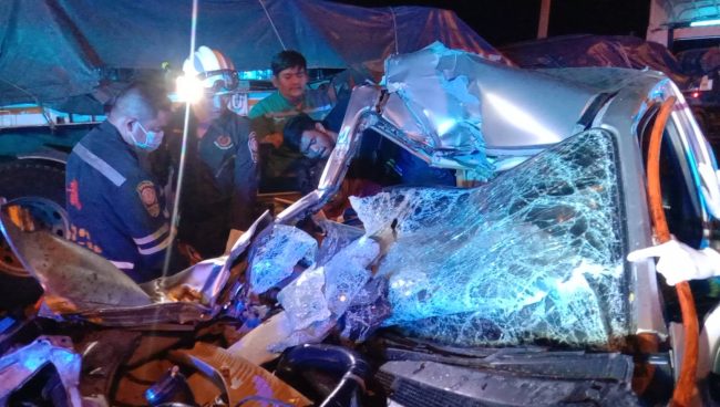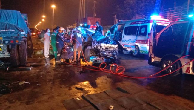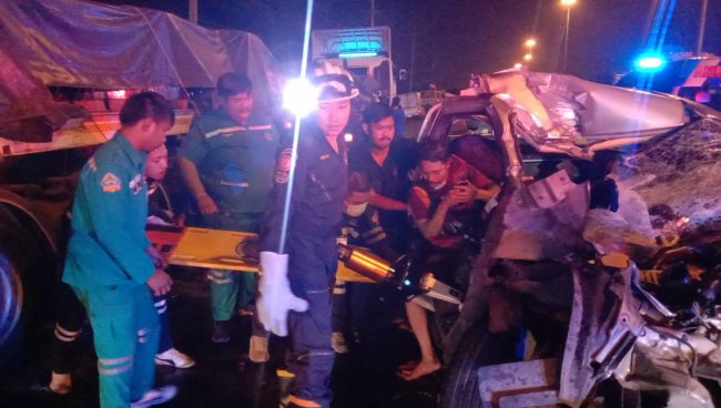 จังหวัดสมุทรสาครรถกระบะบรรทุกพริกเสียหลักชนท้ายบรรทุก 18 ล้อ คนขับติดภายใน ส่วนถุงพริกหล่นเกลื่อนถนน
