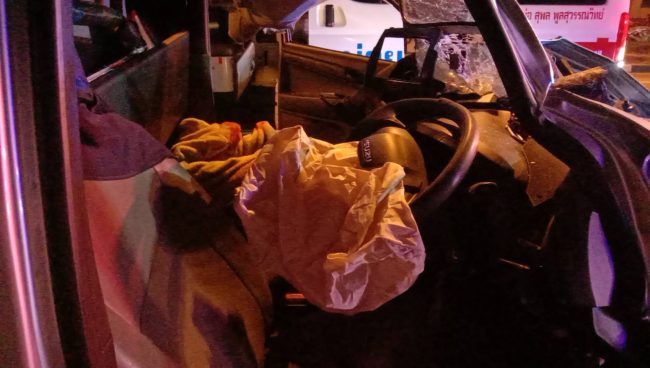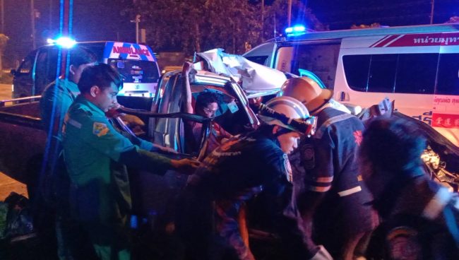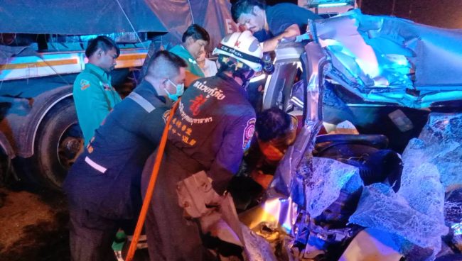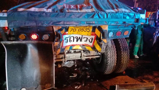 เมื่อเวลา 02.30 น. ของวันที่ 24 กุมภาพันธ์ 2566 ร้อยตำรวจเอก ภูวริษ ปลัดจ่า รองสารวัตรสอบสวน สภ.บางโทรัด ได้รับแจ้งมีอุบัติเหตุรถยนต์กระบะเสียหลักชนท้ายรถบรรทุก 18 ล้อ ที่จอดพักรถอยู่บริเวณด่านชั่งน้ำหนักทางหลวงสมุทรสงคราม หลักกม.ที่ 53 ตำบลนาโคก อำเภอเมือง จังหวัดสมุทรสาคร มีผู้ได้รับบาดเจ็บติดภายในรถจึงได้ประสานเจ้าหน้าที่มูลนิธิการกุศลสมุทรสาครนำอุปกรณ์ตัดถ่างเข้าให้การช่วยเหลืออย่างเร่งด่วน พร้อมรถพยาบาล โดยในที่เกิดเหตุพบรถยนต์กระบะอีซูซุสีบรอนด์ หมายเลขทะเบียน ผฉ – 6683 นครปฐม สภาพหน้ารถพังยับ กระจกแตกละเอียด ยางล้อหลังด้านซ้ายแตก มีคอกเหล็กหลุดจากตัวรถ ถุงพริกหล่นเกลื่อนถนน ส่วนคนขับรถเป็นชายที่ติดอยู่ภายในไม่สามารถออกมาเองได้นั้น ยังคงรู้สึกตัวดีตลอดเวลา โดยทั้งนี้ก็มีเจ้าหน้าที่ตำรวจทางหลวง สทล.2 กก.1 ตำรวจทางหลวงสมุทรสงคราม อำนวยการจราจรอยู่ในที่เกิดเหตุ เพื่อป้องกันการเกิดอุบัติเหตุซ้ำซ้อน ขณะที่ทางเจ้าหน้าที่มูลนิธิการกุศลสมุทรสาครใช้อุปกรณ์ตัดถ่างให้การช่วยเหลือผู้ได้บาดเจ็บประมาณ 30 นาที จึงสามารถช่วยออกมาจากตัวรถได้ พบมีบาดแผลขนาดใหญ่ที่หัวเข่า และข้อเท้าซ้ายถลอกตามร่างกาย เบื้องต้นยังไม่ทราบชื่อ เจ้าหน้าที่มูลนิธิการกุศลสมุทรสาครได้ให้การปฐมพยาบาลแล้วนำส่งโรงพยาบาลสมุทรสาคร นอกจากนี้ใกล้กันยังพบรถบปรรทุก 18 ล้อฮีโน่ หมายเลขทะเบียนด้านหน้า 70 – 0751 พังงา ทะเบียนหลัง (ลูกพ่วง) 70 – 0535 พังงา จอดอยู่ไหล่ทางมีร่องรอยถูกชนบริเวณด้านท้ายได้รับความเสียหาย