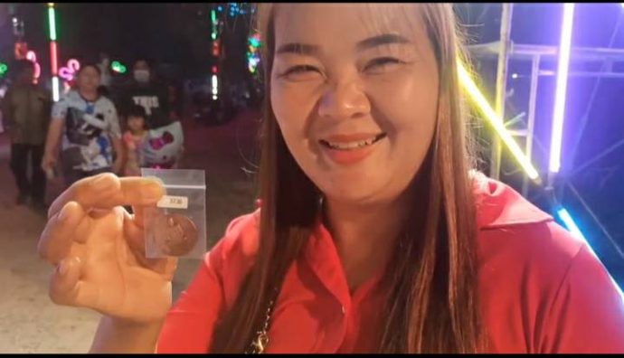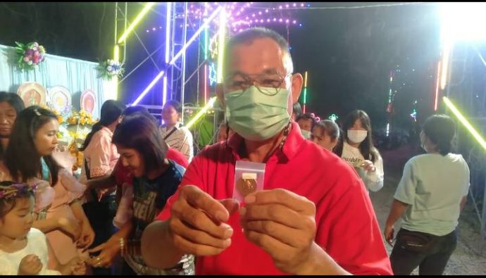 ส่วนบรรยากาศภายในงาน ได้มีประชาชนที่มาร่วมงานกินเลี้ยงนั้น ระหว่างนั้น ได้ยินเสียงพิธี กรประกาศออกไมค์ ว่ามีรางวัลให้ลุ้นอยู่ใต้เก้าอี้ เท่านั้นแหละ ต่างคนต่างก้มดู ยางคนก็ยกเก้าอี้ดูที่ใต้โต๊ะ เพื่อดูกระดาษลุ้นของรางวัลกันมาก บางคนก็นำของรางวัลมาติดที่หน้าที่ตา ด้วยความดีใจ เพื่อสร้างสีสันและความสนุกสนาน หลังจากนั้นก็ได้นำกระดาษลุ้นรางวัลไปรับของรางวัลที่ด้านหน้าประตูเข้างาน โดยของรางวัล ก็จะเป็นเหรียญหลวงพ่อเสน่ห์ และของรางวัลอีก 200 ชิ้น ดังกล่าว