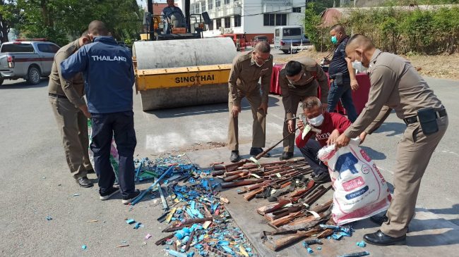 ผบก ภจว. อน. ทำลายของกลางอาวุธปืนด้วยรถบด ท่ามกลาง สื่อมวลชน เจ้าหน้าที่ตำรวจ