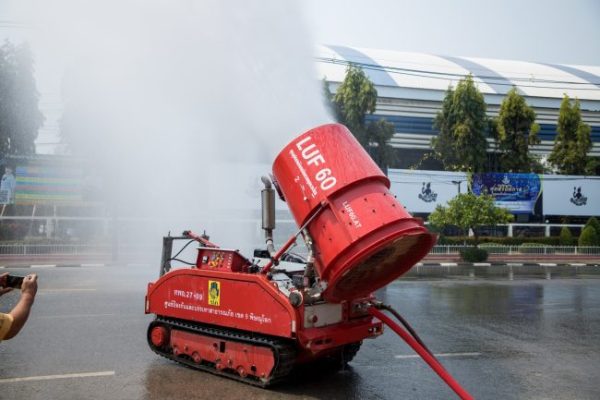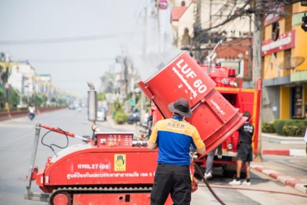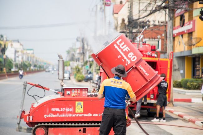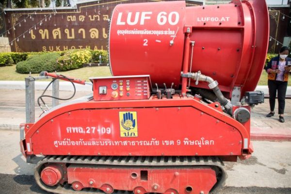 วันนี้ (3 กุมภาพันธ์ 2566) เวลา 13.00 น. สำนักงานป้องกันและบรรเทาสาธารณภัยจังหวัดสุโขทัย โดย นายพล เชื้อทหาร หัวหน้าสำนักงานป้องกันและบรรเทาสาธารณภัยจังหวัดสุโขทัย นางพัฒสอน ดอนพิมพา นายกเทศมนตรีเมืองสุโขทัยธานี นายสมศักดิ์ เวชสุวรรณ รองนายกเทศมนตรีสุโขทัยธานี นำชุดอุปกรณ์ดับเพลิงระยะไกล LUF60 ฉีดพ่นละอองน้ำเพื่อเพิ่มความชุ่มชื้นในอากาศ กำจัดฝุ่นละอองขนาดเล็ก PM 2.5 บริเวณ หน้าเทศบาลเมืองสุโขทัยธานี หลังค่าปริมาณฝุ่นละอองขนาดเล็กPM2.5 เกินค่ามาตรฐาน และพบจุดความร้อนสูง โดยเมื่อเวลา 08.00 น. จังหวัดสุโขทัย ณ สถานีตรวจวัดคุณภาพอากาศสวนสาธารณะชุมชนเลอไทยเทศบาลเมืองสุโขทัยธานี ตำบลธานี อำเภอเมืองสุโขทัย จังหวัดสุโขทัย พบมีค่าดัชนีคุณภาพอากาศโดยรวม (AQI) เท่ากับ 286 ซึ่งส่งผลกระทบ ต่อสุขภาพ จึงขอความร่วมมือให้ประชาชนสวมหน้ากากอนามัย และงดการเผาทุกชนิด เพื่อลดปริมาณค่าฝุ่นละอองขนาดเล็ก PM2.5 ในพื้นที่จังหวัดสุโขทัย