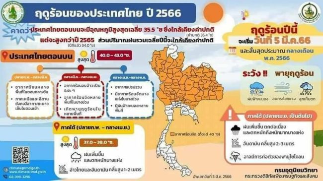 ทางด้านเจ้าหน้าที่สถานีอุตุนิยมวิทยาลำปางแจ้งว่า กรมอุตนิยมวิทยา โดย น.ส.ชมภารี ชมภูรัตน์ อธิบตีกรมอุตุนิยมวิทยา ลงนามในประกาศ เรื่อง การเข้าสู่ฤดูร้อนของประเทศไทย พ.ศ.2566 ประเทศไทยจะสิ้นสุดฤดูหนาวและเริ่มเข้าสู่ฤดูร้อน ในวันที่ 5 มี.ค.2566 โดยในตอนกลางวันพื้นที่ส่วนใหญ่บริเวณประเทศไทยตอนบนจะมีอากาศรัอนโดยทั่วไปอย่างต่อเนื่อง อุณหภูมิสูงสุดตั้งแต่ 35 องศาขึ้นไป ประกอบกับ มรสุมตะวันออกเฉียงเหนือที่พัดปกคลุมประเทศไทยตอนบนได้เปลี่ยนเป็นลมตะวันออกเฉียงใต้หรือลมฝ่ายใต้พัดปกคลุมแทน จึงเป็นการเข้าสู่ฤดูร้อนของประเทศไทย