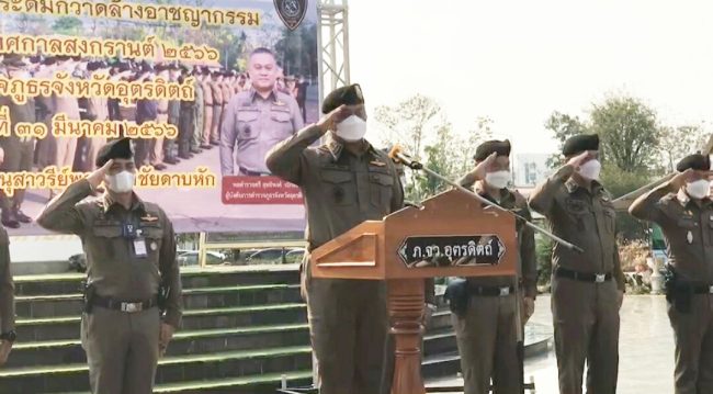ผู้สื่อข่าวรายงานว่า พล.ต.ต.สุทธิพงศ์ เป๊กทอง ผบก.ภ.จว.อุตรดิตถ์ เป็นประธานพิธีปล่อยแถวกวาดล้างอาชญากรรมและยาเสพติดช่วงเทศกาลสงกรานต์ ประจำปี 2566 โดยมี พ.ต.อ.สมนึก มากมี รอง ผบก.ภ.จว.อุตรดิตถ์,พ.ต.อ.สมศักดิ์ อู่ตุ้ม รอง ผบก.ภ.จว.อุตรดิตถ์,พ.ต.อ.พีระเพชร อุบลจิตต์ รอง ผบก.ภ.จว.อุตรดิตถ์ , พ.ต.อ.สมเกษม จารักษ์ ผกก.สภ.เมืองอุตรดิตถ์ , สภ.ลับแล , สภ.ด่านแม่คำมัน , สภ.วังกะพี้, หัวหน้าหน่วย พฐ.อุตรดิตถ์ , ทล.6 กก.5 บก.ทล. , ทท.1 กก.2 บก.ทท.2 , รฟ.(ศิลาอาสน์) กก.1 บก.รฟ., ตม.อุตรดิตถ์, ผู้แทนฝ่ายปกครอง, ปภ.จว.อุตรดิตถ์ , สรรพสามิตฯ , ข้าราชการตำรวจในสังกัด ฯ