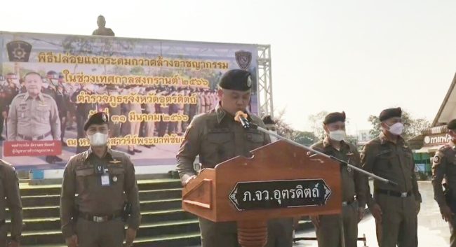 ร่วมพิธีปล่อยแถว ณ บริเวณหน้าอนุสาวรีย์พระยาพิชัยดาบหัก ถนนประชานิมิตร ต.ท่าอิฐ อ.เมืองอุตรดิตถ์ โดยเน้นเป้าหมายความผิดเกี่ยวกับการพนันทุกประเภท,ความผิดเกี่ยวกับยาเสพติดให้โทษ, ความผิดเกี่ยวกับการลักลอบหลบหนีเข้าเมือง , ความผิดเกี่ยวกับอาวุธปืน เครื่องกระสุนปืนและวัตถุระเบิด , ความผิดบุคคลต่างด้าวหลบหนีเข้าเมือง,สืบสวนติดตามจับกุมผู้ต้องหาตามหมายจับคดีค้างเก่า , อาชญากรรมทางเทคโนโลยีและความผิดอื่นๆทุกประเภทและการดูแลอำนวยความสะดวกด้านการจราจร การป้องกันและลดอุบัติเหตุ ช่วงเทศกาลสงกรานต์ 11-17 เม.ย.66