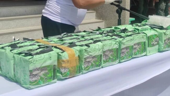 เมื่อเวลา 11.00 น. วันที่ 3 มิ.ย.66 ที่ สภ.ตากใบ จ.นราธิวาส นายสนั่น พงษ์อักษร ผวจ.นราธิวาส พล.ต.ต.อนุรุธ อิ่มอาบ ผบก.ภ.จว.นราธิวาส พ.ต.อ.ศุภชัช ณ พัทลุง ผกก.สภ.ตากใบ นายดำรงศักดิ์ แก้วดวง นายอำเภอตากใบ พ.อ.ก่อเกียรติ เข็มแดง รอง ผบ.ฉก.นราธิวาส และเจ้าหน้าที่ที่เกี่ยวข้อง ได้ร่วมแถลงข่าวการจับกุมตัวนายชาญชัย ไกรรินทร์ อายุ 29 ปี อยู่บ้านเลขที่ 117/2 ม.12 ต.พนางตุง อ.ควนขนุน จ.พัทลุง พร้อมยาไอซ์ จำนวน 10 กระสอบ น้ำหนัก 250 ก.ก. ซึ่งมีมูลค่า 50 ล้านบาท เมื่อลักบอบส่งข้ามประเทศจะมีราคาสูงถึง 100 ล้านบาท ที่อำพรางบรรทุกไว้ในกระบะหลัง ของรถยนต์ 10 ล้อ ยี่ห้อฮีโน่ สีขาว ทะเบียน 71-3122 เพชรบุรี ที่มีผ้าใบคลุมทับอีกชั้นหนึ่ง ขณะขับผ่านบนถนนเส้นทางในหมู่บ้านสะหริ่ง ม.1 ต.โฆษิต อ.ตากใบ จ.นราธิวาส เมื่อเวลา 12.00 น.ของวันที่ 1 มิ.ย.66 ที่ผ่านมา เจ้าหน้าที่ได้ทำการขยายผลตรวจยึดของกลางต่างๆเพิ่มเติมอีกหลายรายการ