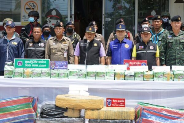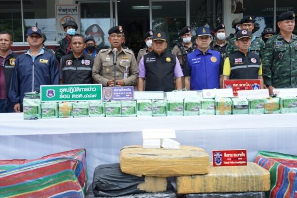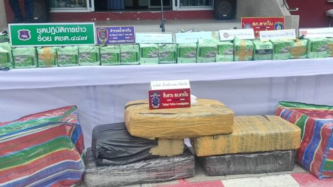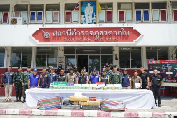 เมื่อเวลา 11.00 น. วันที่ 3 มิ.ย.66 ที่ สภ.ตากใบ จ.นราธิวาส นายสนั่น พงษ์อักษร ผวจ.นราธิวาส พล.ต.ต.อนุรุธ อิ่มอาบ ผบก.ภ.จว.นราธิวาส พ.ต.อ.ศุภชัช ณ พัทลุง ผกก.สภ.ตากใบ นายดำรงศักดิ์ แก้วดวง นายอำเภอตากใบ พ.อ.ก่อเกียรติ เข็มแดง รอง ผบ.ฉก.นราธิวาส และเจ้าหน้าที่ที่เกี่ยวข้อง ได้ร่วมแถลงข่าวการจับกุมตัวนายชาญชัย ไกรรินทร์ อายุ 29 ปี อยู่บ้านเลขที่ 117/2 ม.12 ต.พนางตุง อ.ควนขนุน จ.พัทลุง พร้อมยาไอซ์ จำนวน 10 กระสอบ น้ำหนัก 250 ก.ก. ซึ่งมีมูลค่า 50 ล้านบาท เมื่อลักบอบส่งข้ามประเทศจะมีราคาสูงถึง 100 ล้านบาท ที่อำพรางบรรทุกไว้ในกระบะหลัง ของรถยนต์ 10 ล้อ ยี่ห้อฮีโน่ สีขาว ทะเบียน 71-3122 เพชรบุรี ที่มีผ้าใบคลุมทับอีกชั้นหนึ่ง ขณะขับผ่านบนถนนเส้นทางในหมู่บ้านสะหริ่ง ม.1 ต.โฆษิต อ.ตากใบ จ.นราธิวาส เมื่อเวลา 12.00 น.ของวันที่ 1 มิ.ย.66 ที่ผ่านมา เจ้าหน้าที่ได้ทำการขยายผลตรวจยึดของกลางต่างๆเพิ่มเติมอีกหลายรายการ