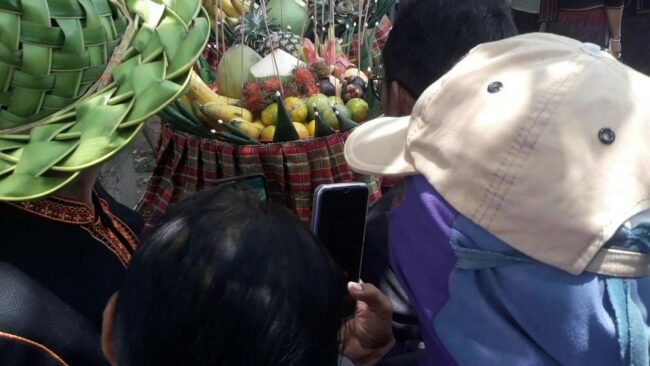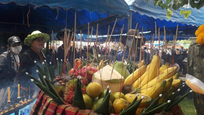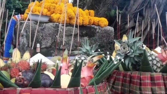 โดยปีนี้เครื่องเซ่นบวงสรวงชาวชุมชน3ชนเผ่าได้นําเครื่องเซ่นมาถวายได้แก่ผลไม้ต่างๆ พวงมาลัยดอกงาม ข้าวต้ม ข้าวขนม เครื่องดื่มนํ้าสี พร้อมผ้า7สี และมีการรําบวงสรวงจาก3ชนเผ่า ชาวกูยร์ ชาวเขมร ชาวลาว เพื่อบอกกล่าวให้ การจัดงานประเพณีบุญบั้งไฟประเพณีเชื่อมสานสัมพันธ์3ชนเผ่าปีนี้ชึ่งทุกๆปีทางอําเภอเมืองจันทร์จะจัดในช่วงเดือน7 ของทุกๆปี เพื่อให้งานประเพณีบุญบั้งไฟประจําปีนี้ไม่ให้เกิดภัยอันตรายใดๆเพื่อให้งานเป็นไปด้วยความราบรื่น และให้พญาแถนประทานฟ้าฝนตกตามฤดูกาลในฤดูทํานา……………………………………………..