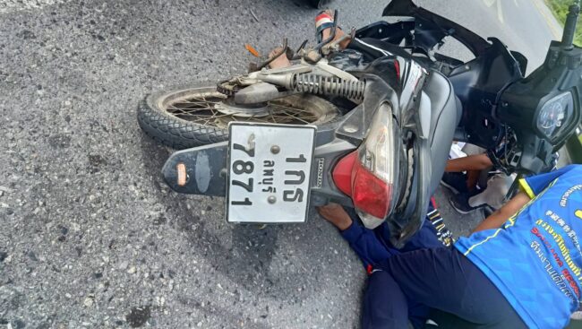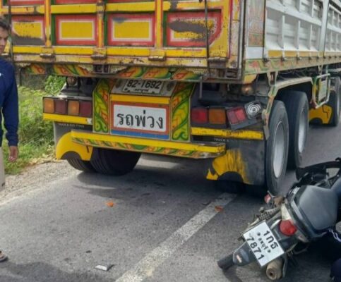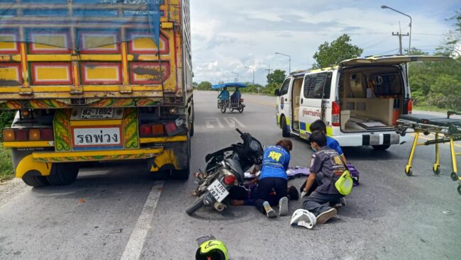 จังหวัดลพบุรี  สาวใหญ่ไม่ทันระวังขับจักรยานยนต์ชนท้ายรถพ่วงดับคาที่