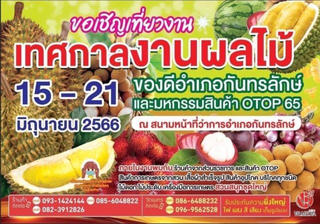 เมื่อวันที่ 16 มิถุนายน 2566 ที่บริเวณสนามหน้าที่ว่าการอำเภอกันทรลักษ์ จังหวัดศรีสะเกษ นายสำรวย เกษกุล ผู้ว่าราชการจังหวัดศรีสะเกษ ได้เป็นประธานเปิดงานเทศกาลผลไม้และของดีอำเภอกันทรลักษ์ ประจำปี 2566 จัดขึ้นระหว่างวันที่ 15-21 มิถุนายน 2566 โดยมีนายอนุรัตน์ ธรรมประจำจิต และนางสาวชนมณัฐ รอดบุญธรรม รองผู้ว่าราชการจังหวัดศรีสะเกษ นายวิชิต ไตรสรณกุล นายกองค์การบริหารส่วนจังหวัดศรีสะเกษ นายสุกิจ เหลืองสกุลไทย นายอำเภอกันทรลักษ์ หัวหน้าส่วนรชการจังหวัดศรีสะเกษ นำเกษตรกรผู้ปลูกทุเรียนภูเขาไฟอำเภอกันทรลักษ์ ร่วมในพิธีเปิดงานทศกาลผลไม้และของดีอำเภอกันทรลักษ์ปี2566 เป็นจำนวนมาก ภายในงานมีกิจกรรมการจำหน่ายผลผลิตทางการเกษตรกรรม เช่น ทุเรียนภูเขาไฟ GI อำเภอกันทรลักษ์ เงาะ มังคุด ลองกอง ฝรั่ง ลิ้นจี่ สะตอ การประกวดผลผลิตทางการเกษตร การประมูลทุเรียนภูเขาไฟอำเภอกันทรลักษ์ การแสดงศิลปะวัฒนธรรมขนบธรรมเนียมประเพณีและอัตลักษณ์ท้องถิ่น การประกวดแข่งขันผ้าแส่วเบญจศรีและการประกวดแข่งขันแส่วผ้าเบญจศรี การออกร้านสินค้าโอทอปผลิตภัณฑ์ของกลุ่มแม่บ้านอำเภอกันทรลักษ์ โดยมีวัตถุประสงค์เพื่อเป็นการประชาสัมพันธ์ผลผลิตของเกษตรกร และการท่องเที่ยวของอำเภอกันทรลักษ์ให้เป็นที่รู้จักของคนไทยและชาวต่างชาติ เพื่อเป็นการสร้างขวัญและกำลังใจให้แก่เกษตรกร การสร้างองค์ความรู้ใหม่ด้านการเกษตรกรรมและการสร้างแรงจูงใจในการพัฒนาคุณภาพผลผลิตการเกษตร เพื่อเป็นการส่งเสริมการตลาด สินค้าการเกษตรให้มีช่องทางการจำหน่ายและเป็นที่เชื่อถือของผู้บริโภค เพื่อส่งเสริมการท่องเที่ยวเชิงเกษตรและวัฒนธรรมพื้นที่อีสานตอนใต้ และส่งเสริมศิลปวัฒนธรรมพื้นบ้านประจำถิ่น เพื่อเป็นการนันทนาการ สร้างการมีส่วนร่วมของชาวอำเภอกันทรลักษ์ และเพื่อเป็นการส่งเสริมการออกกำลังกาย พัฒนาศักยภาพทรัพยากรมนุษย์ในพื้นที่อำเภอกันทรลักษ์ต่อไป