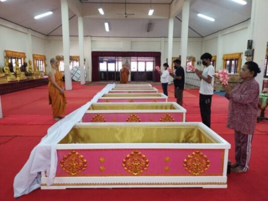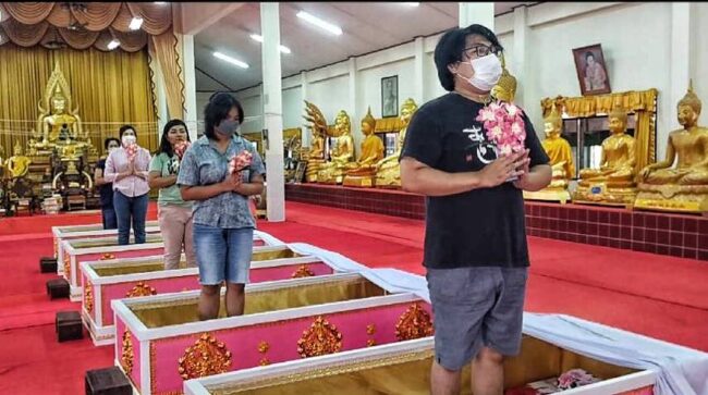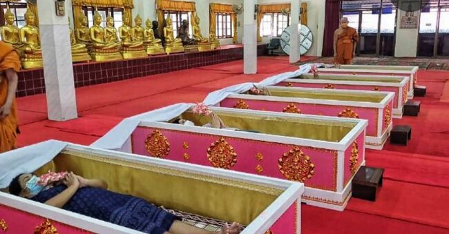 วัดหลวงพ่อปากแดง จัดพิธีนอนโลงศพสะเดาะเคราะห์ต่อชะตา ฝึกตายก่อนตายจริงฝึกสติให้คิดได้ว่าทุกคนหนีไม่พ้นความตาย
