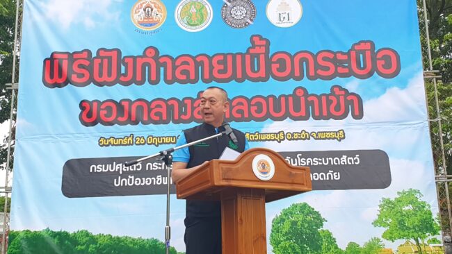 ดร.เฉลิมชัย ศรีอ่อน รัฐมนตรีว่าการกระทรวงเกษตรและสหกรณ์ เป็นประธานพิธีฝังทำลายเนื้อกระบือของกลางลักลอบนำเข้า ณ ศูนย์กักกันสัตว์เพชรบุรี ตำบลสามพระยา อำเภอชะอำ จังหวัดเพชรบุรี โดยระบุว่า ได้มอบนโยบายให้กรมปศุสัตว์ร่วมกับหน่วยงานที่เกี่ยวข้อง ปฏิบัติงานบังคับใช้กฎหมายในการตรวจสอบและดำเนินคดีกับผู้ลักลอบนำเข้าเนื้อกระบือและโคอย่างเคร่งครัด เพื่อปกป้องเกษตรกรผู้เลี้ยงกระบือและโคเนื้อเนื่องจากการลักลอบนำเข้าเนื้อกระบือและโค จะทำลายกลไกราคาภายในประเทศ ทั้งยังอาจเป็นพาหะของโรคระบาดสัตว์ ซึ่งจะสร้างความเสียหายต่อระบบการเลี้ยงกระบือและโคเนื้อของประเทศไทยอย่างมหาศาล นอกจากนี้ยังเป็นการคุ้มครองผู้บริโภคเนื่องจากเนื้อกระบือและเนื้อโคที่ลักลอบนำเข้าโดยไม่ผ่านการตรวจสอบอาจมีเชื้อโรคและสารตกค้างที่ไม่ปลอดภัยต่อผู้บริโภค