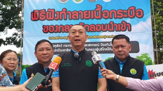 ดร.เฉลิมชัย ศรีอ่อน รัฐมนตรีว่าการกระทรวงเกษตรและสหกรณ์ เป็นประธานพิธีฝังทำลายเนื้อกระบือของกลางลักลอบนำเข้า ณ ศูนย์กักกันสัตว์เพชรบุรี ตำบลสามพระยา อำเภอชะอำ จังหวัดเพชรบุรี โดยระบุว่า ได้มอบนโยบายให้กรมปศุสัตว์ร่วมกับหน่วยงานที่เกี่ยวข้อง ปฏิบัติงานบังคับใช้กฎหมายในการตรวจสอบและดำเนินคดีกับผู้ลักลอบนำเข้าเนื้อกระบือและโคอย่างเคร่งครัด เพื่อปกป้องเกษตรกรผู้เลี้ยงกระบือและโคเนื้อเนื่องจากการลักลอบนำเข้าเนื้อกระบือและโค จะทำลายกลไกราคาภายในประเทศ ทั้งยังอาจเป็นพาหะของโรคระบาดสัตว์ ซึ่งจะสร้างความเสียหายต่อระบบการเลี้ยงกระบือและโคเนื้อของประเทศไทยอย่างมหาศาล นอกจากนี้ยังเป็นการคุ้มครองผู้บริโภคเนื่องจากเนื้อกระบือและเนื้อโคที่ลักลอบนำเข้าโดยไม่ผ่านการตรวจสอบอาจมีเชื้อโรคและสารตกค้างที่ไม่ปลอดภัยต่อผู้บริโภค