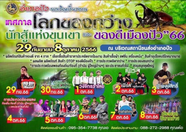 รวมถึงส่งเสริมการท่องเที่ยวของอำเภอปัวในรูปแบบของศิลปะวัฒนธรรมพื้นบ้าน โดย อำเภอป้ว องค์กรปกครองส่วนท้องถิ่น สภาวัฒนธรรมอำเภอปัว กำนันผู้ใหญ่บ้าน ชมรมกว่างอำเภอปัว สมาคมท่องเที่ยวอำเภอปั่ว องค์กรภาคเอกชน มีกำหนดให้มีการจัดงาน “เทศกาลโลกของกว่าง นักสู้แห่งขุนเขา และงานของดีเมืองปัว ประจำปี 2566 ระหว่างวันที่ 29 กันยายน – 8 ตุลาคม พ.ศ. 2566 ณ บริเวณสถานีขนส่งอำเภอปัว