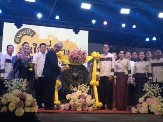 นายกฤชเพชร เพชระบูรณิน รองผู้ว่าราชการจังหวัดน่าน ประธานในพิธีลั่นฆ้องเปิดงานฯ ณ บริเวณสถานีขนส่งอำเภอปัว จังหวัดน่าน พร้อมมหกรรมสินค้าต่างๆ มากมาย