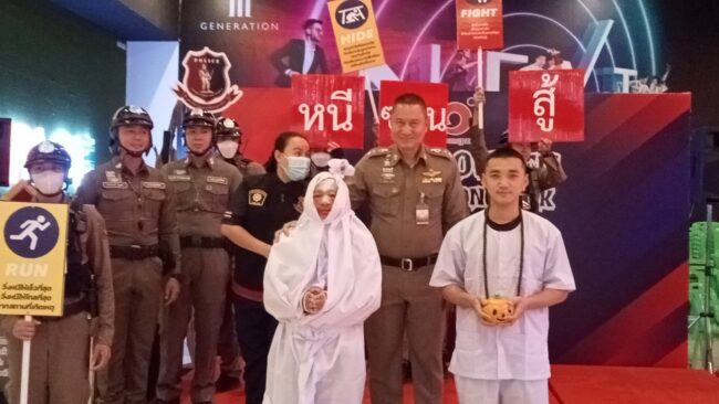 และได้แนะนำวิธีป้องกันบุคคลคลุ้มคลั่งเบื้องต้น แนะนำวิธีการเอาตัวรอดเหตุกราดยิง สาธิตวิธีการ และการปฏิบัติหากเกิดกรณีดังกล่าว พร้อมทั้งได้มีการแจกอมยิ้มให้กับประชาชน ที่เข้ามาใช้บริการดังกล่าว ณ โรงภาพยนตร์ Major cineplex สาขา ห้างสรรพสินค้าศรีพงศ์ กรุ๊ป อ.เมือง จ.อุตรดิตถ์
