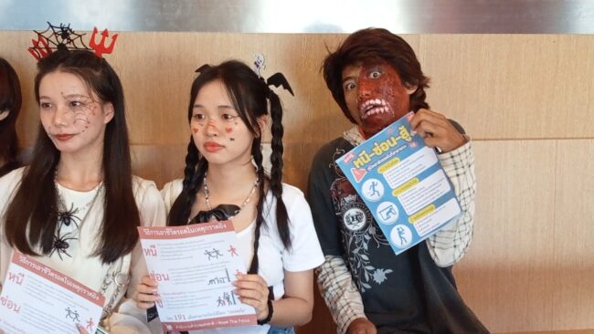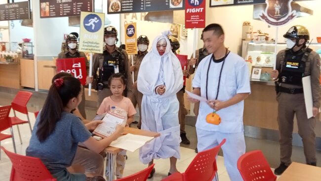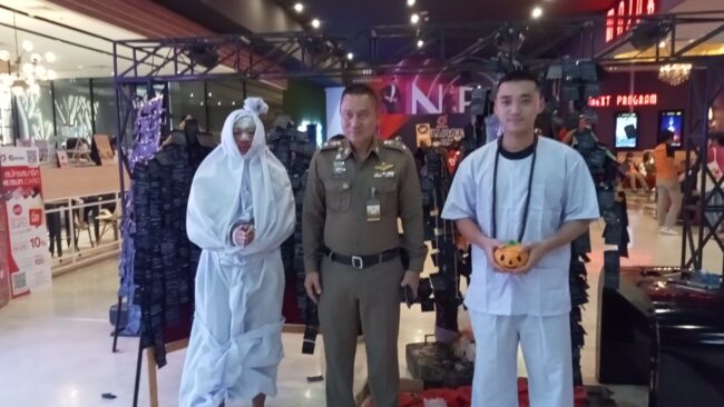 ตร.สภ.เมืองอุตรดิตถ์แต่งชุดธีม “ฮาโลวีน”ประชาสัมพันธ์และแจกแผ่นพับ แนะนำวิธีเอาตัวรอดให้กับประชาชน นักเรียน นักศึกษา ที่มาชมภาพยนตร์