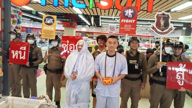 วันที่ 31 ตุลาคม 2566 เวลา 16.00 น. ภายใต้การอำนวยการของ พล.ต.ต.สุทธิพงศ์ เป๊กทอง ผบก.ภ.จว.อุตรดิตถ์ มอบหมายให้ พ.ต.อ.สมเกษม จารักษ์ ผกก.สภ.เมืองอุตรดิตถ์,พ.ต.ท.อำนาจ รอดดอนไพร ,พ.ต.ต.สัณฐิฏิยศ ทองก้อน สว.จร.สภ.เมืองอุตรดิตถ์,พ.ต.ต.ประธาน เล็กคำ สวป.สภ.เมืองอุตรดิตถ์ พร้อมด้วย เจ้าหน้าที่ตำรวจจราจร,สายตรวจชุด 203 เจ้าหน้าที่ตำรวชุดชุมชนสัมพันธ์ สภ.เมืองอุตรดิตถ์ และตำรวจแต่งกายชุดธีมฮาโลวีนเพื่อให้เข้ากับกิจกรรมกับห้าสรรพสิค้า ศรีพงษ์ กรุ๊ป ได้ประชาสัมพันธ์และแจกแผ่นพับ แนะนำวิธีเอาตัวรอดให้กับประชาชน นักเรียน นักศึกษา ที่มาชมภาพยนตร์ ที่โรงภาพยนตร์ Major cineplex ในด้านการป้องกันตนเอง ชึ่งเน้นการทำงานเชิงรุก เพื่ออบรมให้ความรู้ จำลองสถานการณ์ หากมีสถานการณ์ที่อาจกระทบต่อชีวิตและทรัพย์สิน ตลอดจนวิธีเอาตัวรอด เมื่อตกอยู่ในสถานการณ์ที่คับขัน ไม่ปลอดภัย เหตุกราดยิง(อาทิเช่น เหตุ Active Shooter บุคคลคลุ้มคลั่ง วิกลจริต หรือเหตุการณ์ที่อาจเป็นอันตราย หรือกระทบต่อชีวิตและทรัพย์สิน) โดยยึดหลัก Run Hide Fight “หนี ซ่อน สู้”ตามยุทธวิธีตำรวจ โดยมีขั้นตอนดังต่อไปนี้