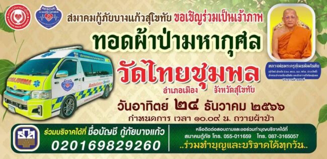 สุโขทัย-ทอดผ้าป่าต่อลมหายใจซื้อรถพยาบาลกู้ภัยช่วยเหลือผู้ประสบสาธารณภัย
