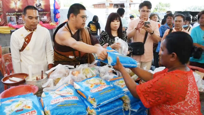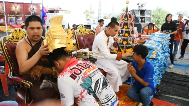 ในพิธี ฤาษีเณร ธาตุพุทธคุณ และ อาจารย์กาวิน มนต์พระมุนี ได้ทำพิธี ไหว้ครู ครอบเศียรพ่อแก่ เจิมหน้าผากเพื่อความเป็นสิริมงคล ให้แก่เจ้าภาพ คือ นางสาว แอน และ นางสาว อี๊ ฉี และ นาย เวน คิมเอ็กซ์ จาก ประเทศมาเลเซีย พร้อมด้วยลูกศิษย์ ชาวมาเลเซีย กว่า 50 คน ได้ร่วมเจิมหน้าผาก และเจิมหน้าผากตุ๊กตาลูกเทพในครั้งนี้ด้วย หลังเสร็จพิธี ได้ร่วมกันแจกทาน ข้าวสาร อาหารแห้ง แก่ผู้ร่วมงานจำนวน 500 ชุด เป็นการช่วยบรรเทาความเดือดร้อนในระดับหนึ่ง