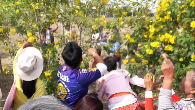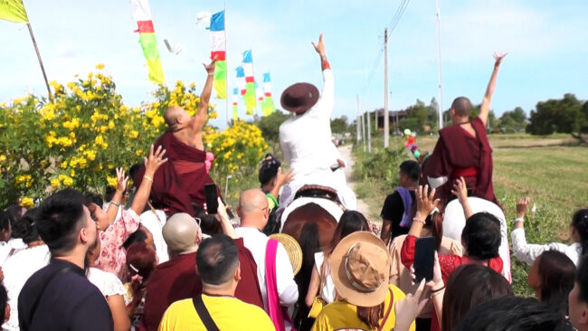 โดยเจ้าสำนักได้จัดขบวนแห่จากตำหนักเก่า มาตำที่หนักแห่งใหม่ โดย อาจารย์กาวิน และพระเถราจารย์ ได้ขี่ม้า โปรยทานช่วงทางเข้าตำหนัก ด้วยธนบัตร ใบละ 20 บาท นับหมื่นบาทแก้ผู้ที่มาร่วมงาน โดยมีผู้ร่วมงานที่ได้ธนบัตรโชว์เลขท้าย 55 ซึ่งตรงกับเลขรถบรรทุกพระพรหม 5055 หลังจากอัญเชิญพระพรหม และองค์ บรมครูปู่เจ้าสมิงพราย ขึ้นตำหนัก ได้มีการจุดประทัด 20,000 นัด เบิกฤกษ์เอาชัย ปรากฏเลขหางประทัดคือเลข 507 – 23 ส่วนเลขทะเบียนรถ ที่บรรทุก องค์บรมครูปู่เจ้าสมิงพราย ก็ไม่พลาดนักเสี่ยงโชคต่างถ่ายเลขทะเบียน 7644 เก็บไว้เพื่อนำไปเสี่ยงโชคต่อไป